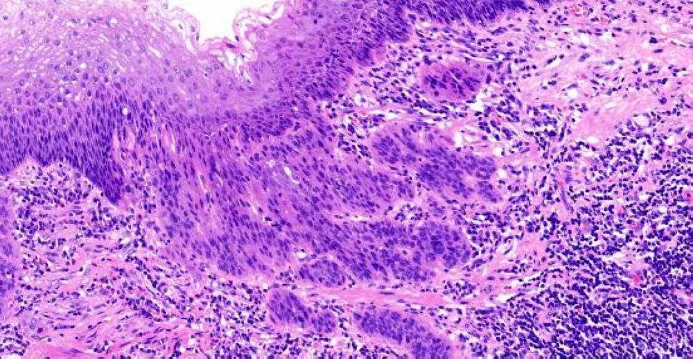 小土豆跟着农人老师学本领-食道手术切除 粘膜表面鳞状上皮缺乏异型性 基底部细胞排列紊乱 浸润性生长 鳞癌